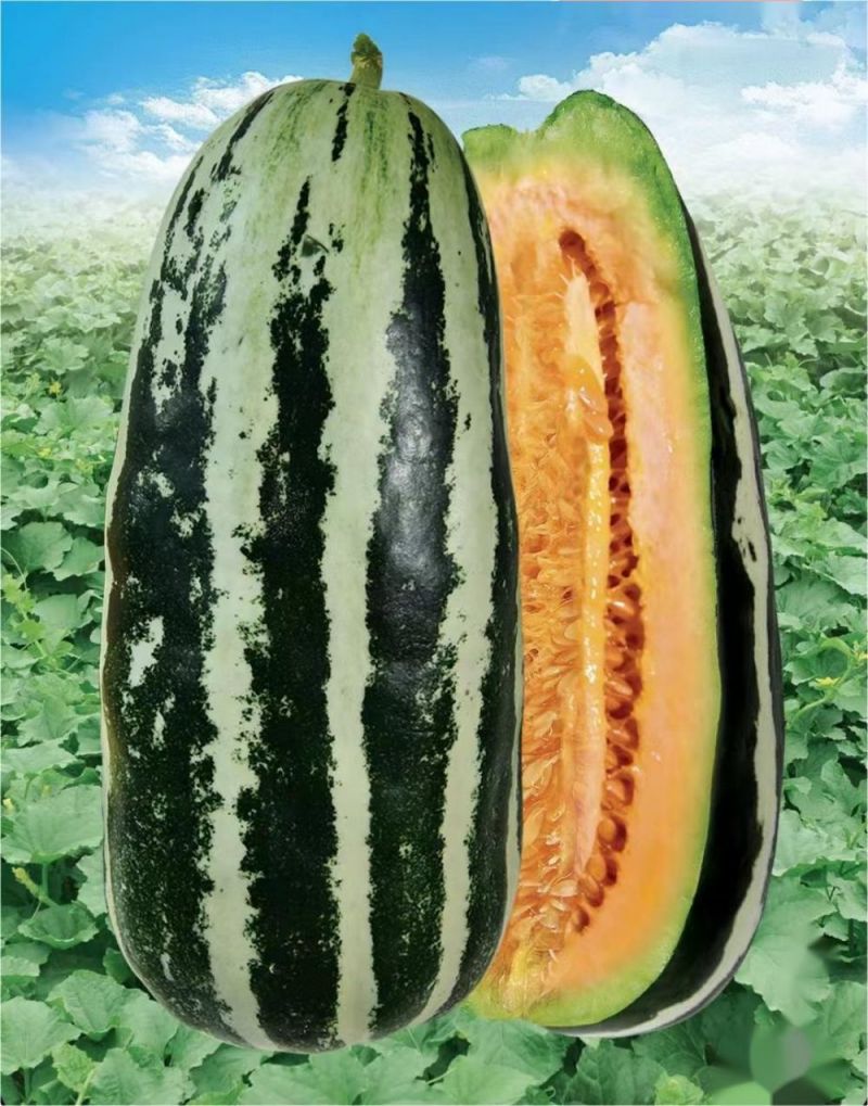 该品种为湖南省蔬菜研究所新育成的早熟甜瓜品种。春季全生育期85天左右,花后27天即可采收;秋季全生育期68天左右,花后24天即可采收。果实筒形,果皮灰白色覆墨绿色条带,果肉桔红色,肉质香脆,口感嫩爽,风味佳。果肉可溶性固形物含量16-18%,单瓜重500-600克,果肉厚2.2厘米左右。植株生长健壮,耐湿抗病,耐糖心,适应性强,易栽培,座果性好。