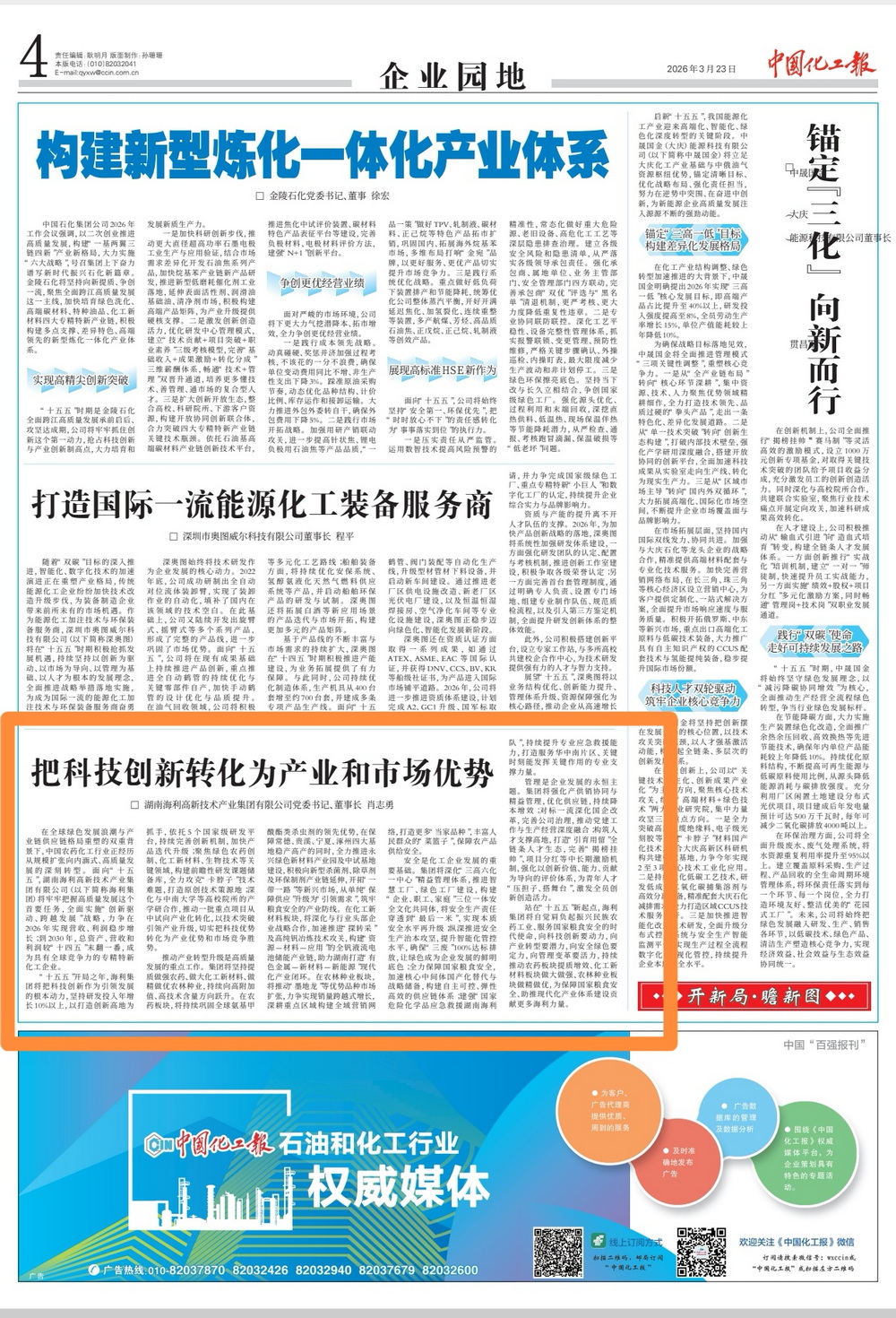 3月23日,《中国化工报》刊发立博·官方(中国)党委书记、董事长肖志勇同志署名文章《把科技创新转化为产业和市场优势》,有力展示了海利集团高质量发展的新担当新作为新成效,是集团党委深入学习贯彻党的创新理论的又一重要成果。
